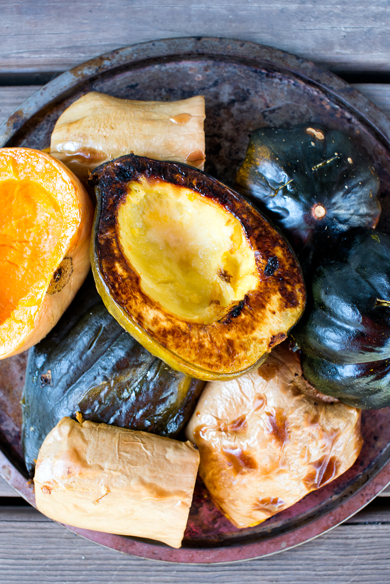 To prep for this soup you will want to roast your squash ahead of time. Cut squash in half and scrape out seeds. Coat with olive oil on the inside and bake uncovered at 350, skin side up. Bake for about 1 hour or until a knife can easily pierce the skin. For this recipe I used one medium butternut squash and two acorn squash.