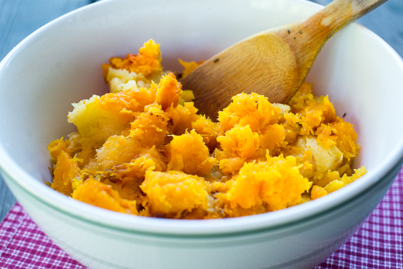 Scoop out the flesh of the squash and set aside in a bowl.