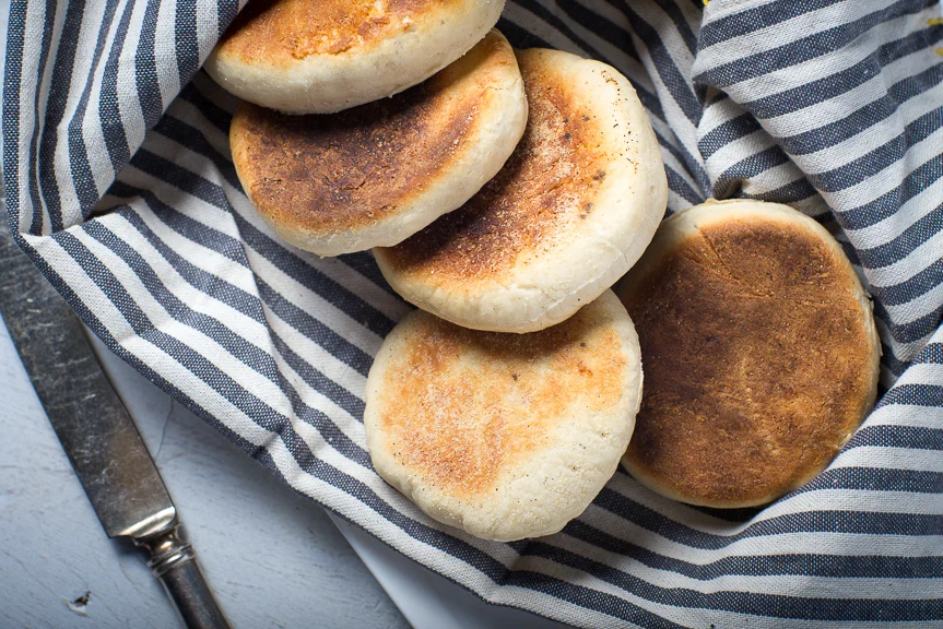 I have been keeping a batch of sour dough starter alive in a big bowl on the counter for a few weeks now. It has made a couple loaves of bread and now these. So far I am in a 3 week long goal of keeping a starter going on Winter. Since I had it on hand it seemed like a no-brainer to make English Muffins.