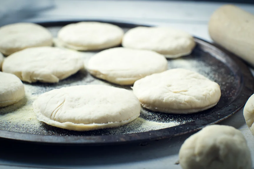 Roll out each ball into a circle about 3 inches in diameter. Use a glass or cookie cutter to make these into perfect 3 inch circles. Place onto a cornmeal covered pan. Loosely cover pan and let rise for 30-40 minutes (Longer is fine. I ran some errands for about an hour while they sat)