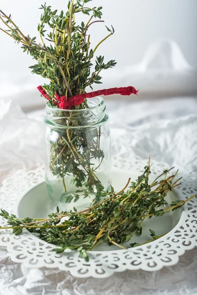 We're also going to need to add some fresh herbs. This is one item that you really need to splurge on in the Winter. The downfall is that they are not a quick walk away in the garden but any store sells a good variety of fresh herbs in the dead of Winter. For this cheese combination I prefer some fresh Thyme. It's just so fragrant and a nice smell when you're eating and looking at the snowfall through the window. To add a little spice we're going to also use from fresh baby arugala.