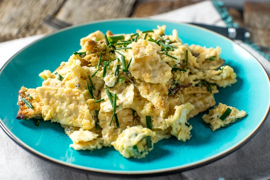 2. Lightly beat eggs in medium bowl. Stir in matzo, chives, and Parmesan, and season with salt and pepper, if desired.