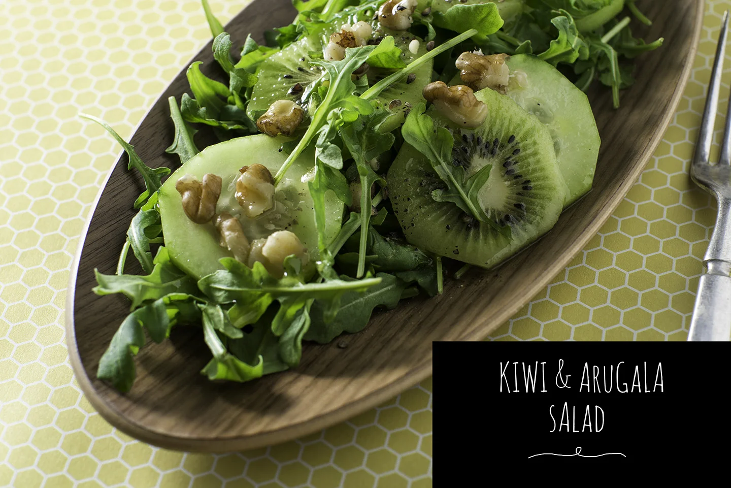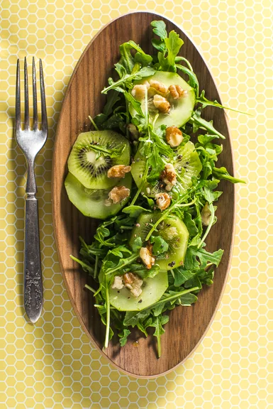 2. Layer the Arugala with the slices of cucumbers and kiwi. Top with Walnut pieces