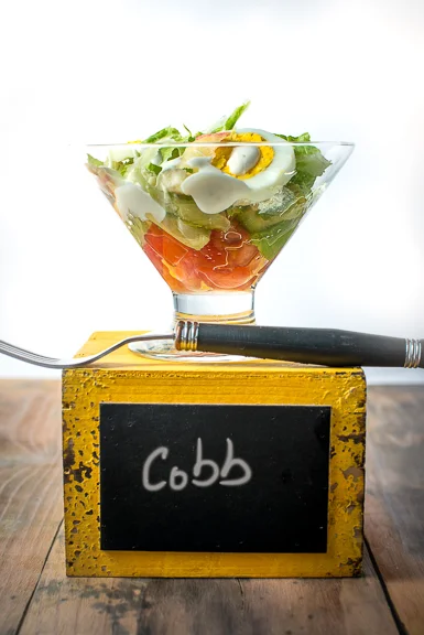 Instead of mixing everything together try and make layers of the vegetables and ingredients. Too many ingredients in a Cobb such as the avocado and eggs will get mushed up if you mix it all together in a bowl. Layer all ingredients several times and then end with some eggs on top, then sprinkle the dressing on top, followed by a good squeeze of a lemon wedge.