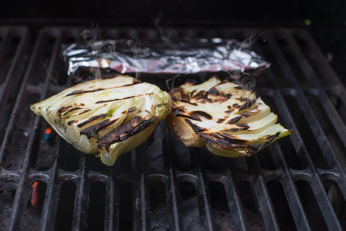 Drizzle the carrot with a little olive oil and wrap in foil. Set aside. Preheat your BBQ to a medium heat. Drizzle the Fennel halves with olive oil and sprinkle with salt. Place these cut side down on the BBQ until scorched. Turn 1/4 and scorch again. Turn them upside down and let sit on the grill, along with the carrots that you wrapped in foil.