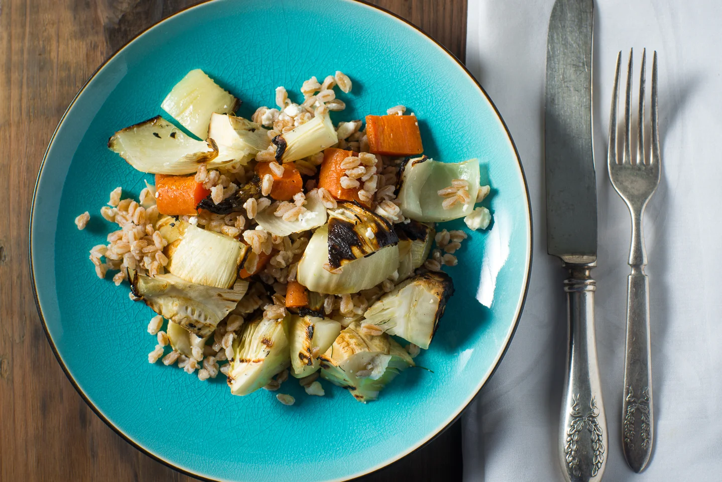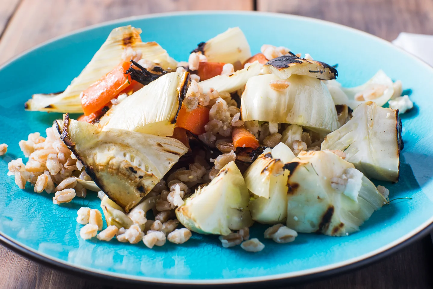 Service the grilled vegetables on top of the drained farro on a plate and serve. Season with Salt and Pepper.