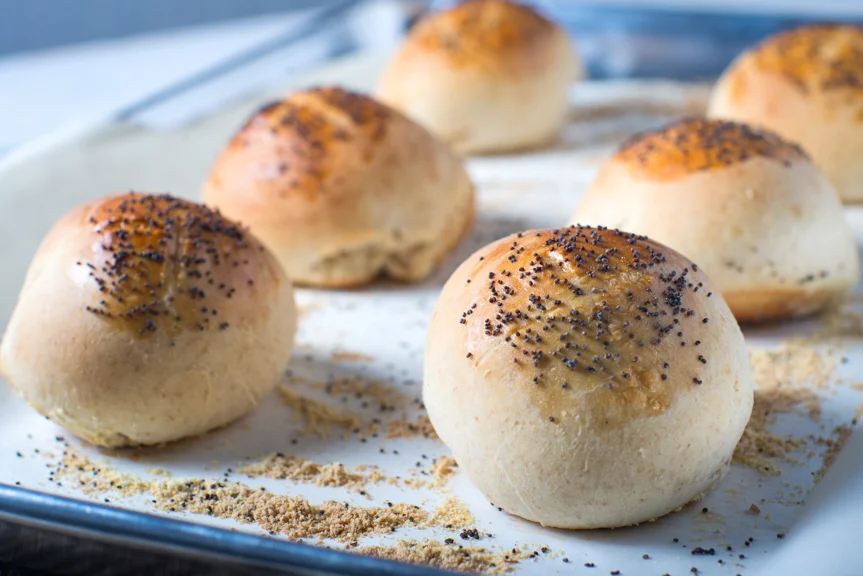 - Cover and let rest for 10 minutes. Cut small cross patterns into the top. Brush with egg whites and top with poppy seeds.