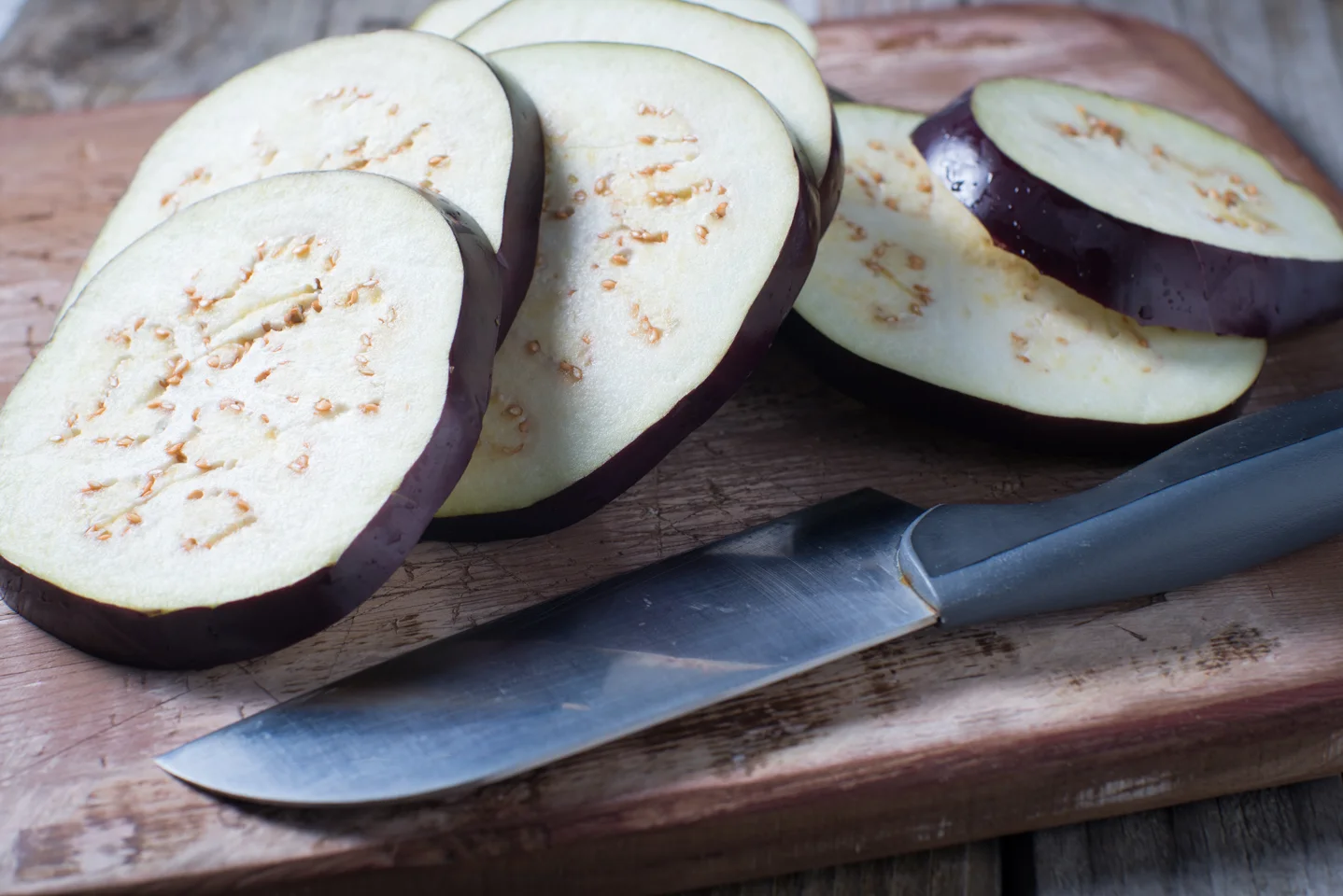 Slice the eggplant with skin still on about 1/4 inch thick. You can leave them as rounds or cut lengthwise to make crescent shapes. You can also just cut them lengthwise to make longer strips.