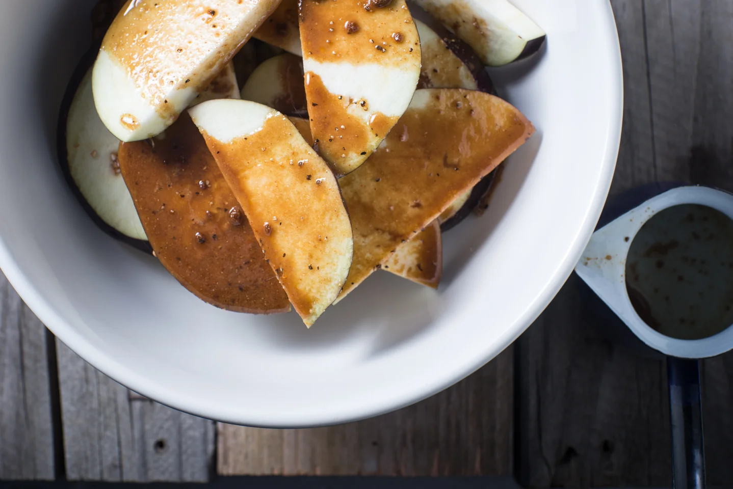 Mix the jerky ingredients and mix with the eggplant. Cover and let this marinate for about 2-3 hours. The eggplant will soak up the sauce and become light brown in color.