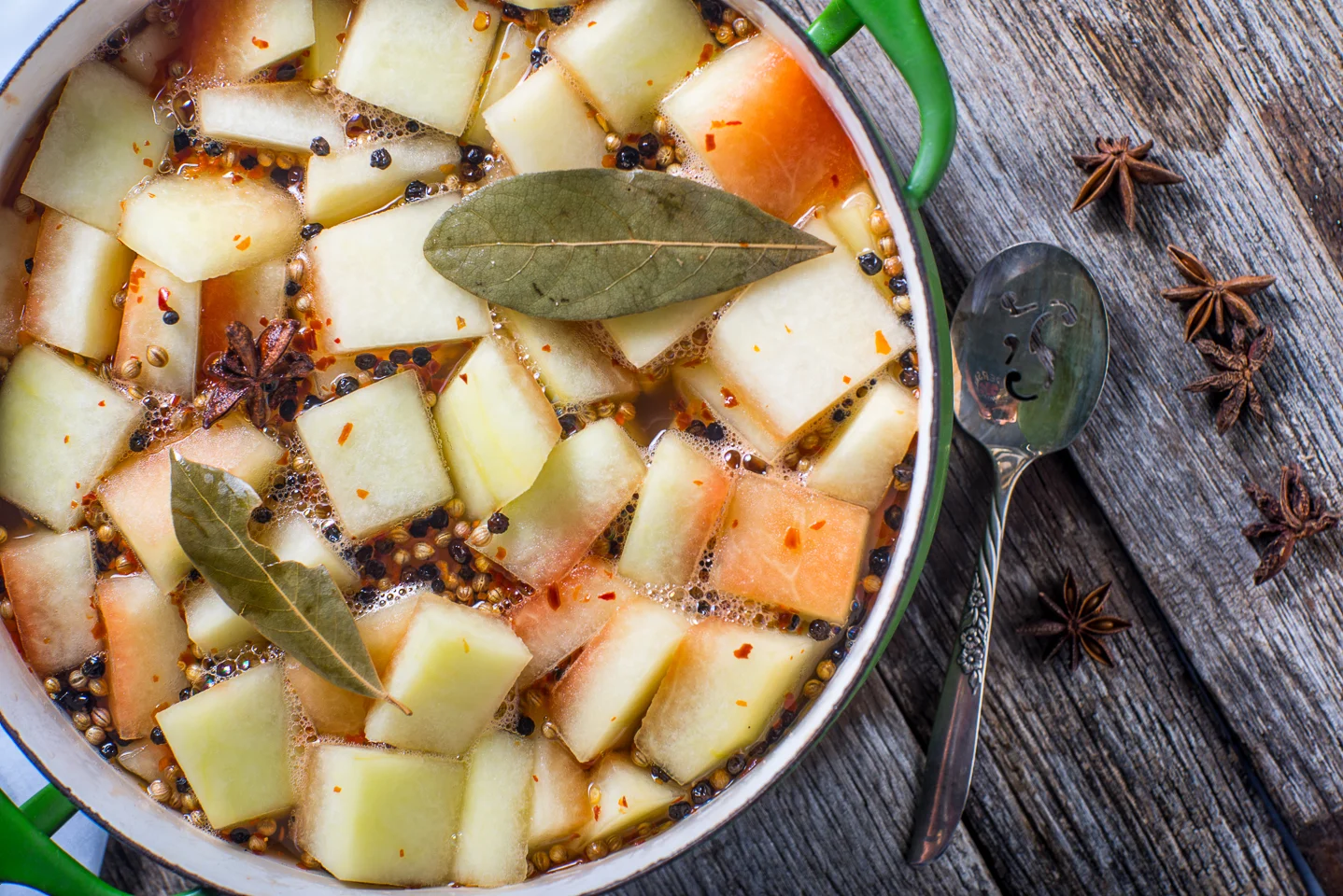Add the watermelon rind and continue cooking for about 5 minutes. At this point remove from heat and let sit for 20 minutes.