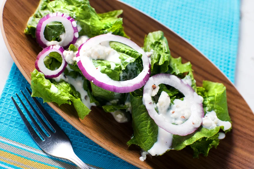 3. Plate the lettuce, then place slices of the onion on top. Spoon the dressing over the top and serve.