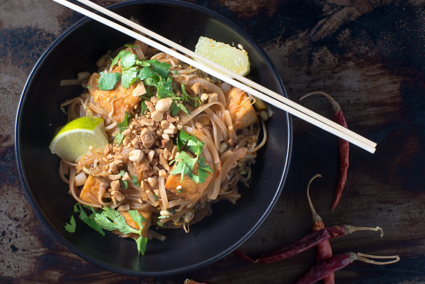 Add the rest of the peanut oil to the wok and cook onions for about 2 minutes. Add garlic and lemongrass and cook another 30 seconds or so. Add the sauce and when it begins to boil and bubble add the noodles. Toss for about 2 minutes in the sauce. Add the tofu, bean sprouts, green onions, and chilies. Toss for a couple of minutes then transfer to bowls.