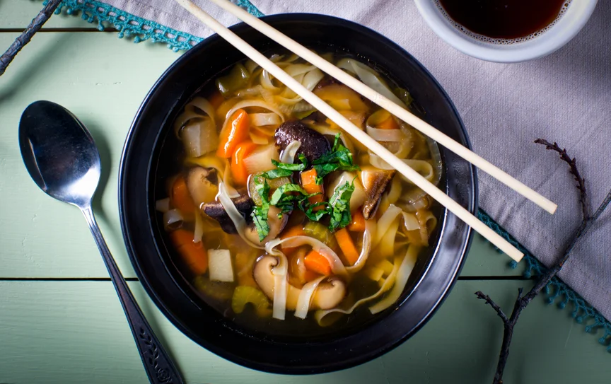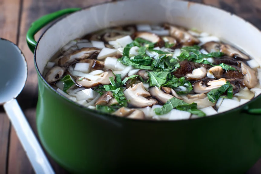 One thing I love about a lot of Asian soups is that they tend to be light and brothy, not thick and creamy. Heading into the New Year with a little extra weight, this is a good thing to knock down on a few calories yet have a great tasting meal. Adding some noodles towards the end of cooking adds some needed starch making it a complete and filling meal yet staying light.