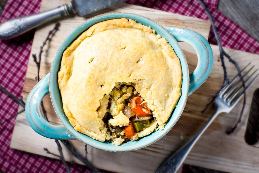 These are great individual serving sized pies. This is a lot like the meat pies that I grew up eating but modified to use a veggie crumble meat substitute that tastes awesome. This is exactly the type of meal that you want when it's cold outside and you need a little comfort.