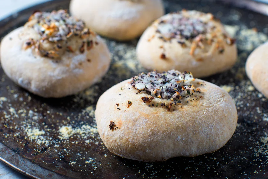 Bialy's are...just wonderful. Think, bagel that not's boiled and more bread-like. That's basically a bialy. They are a bit easier to make than bagels as they don't require that extra step of boiling prior to baking. They also do not have holes in the middle- but rather a depression on the surface that is filled with diced onion and herbs. If you plan it right each bite is accompanied by sweet onions. These use onions, rosemary, and poppy seeds- very savory and the onion gets nice and sweet while it's baking.